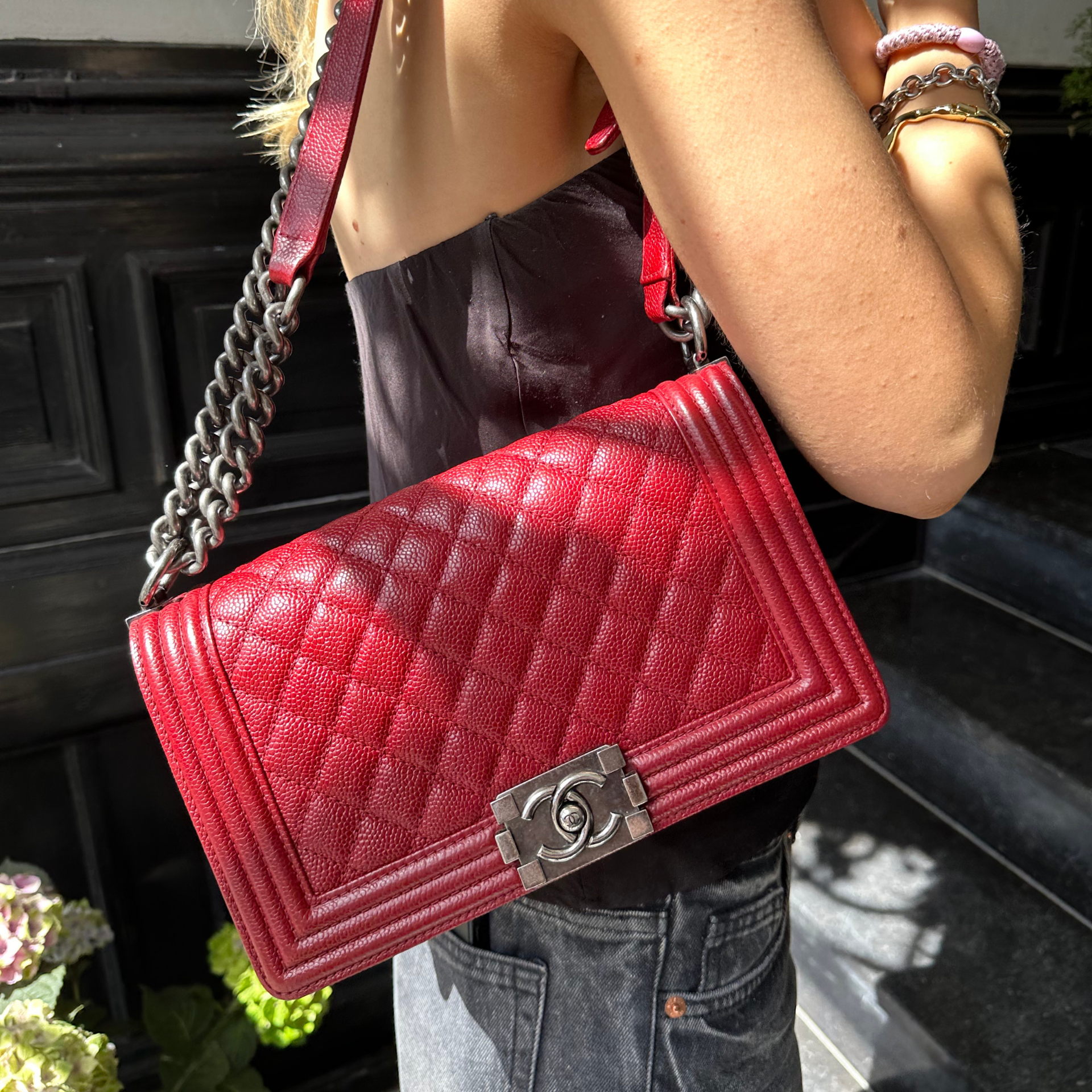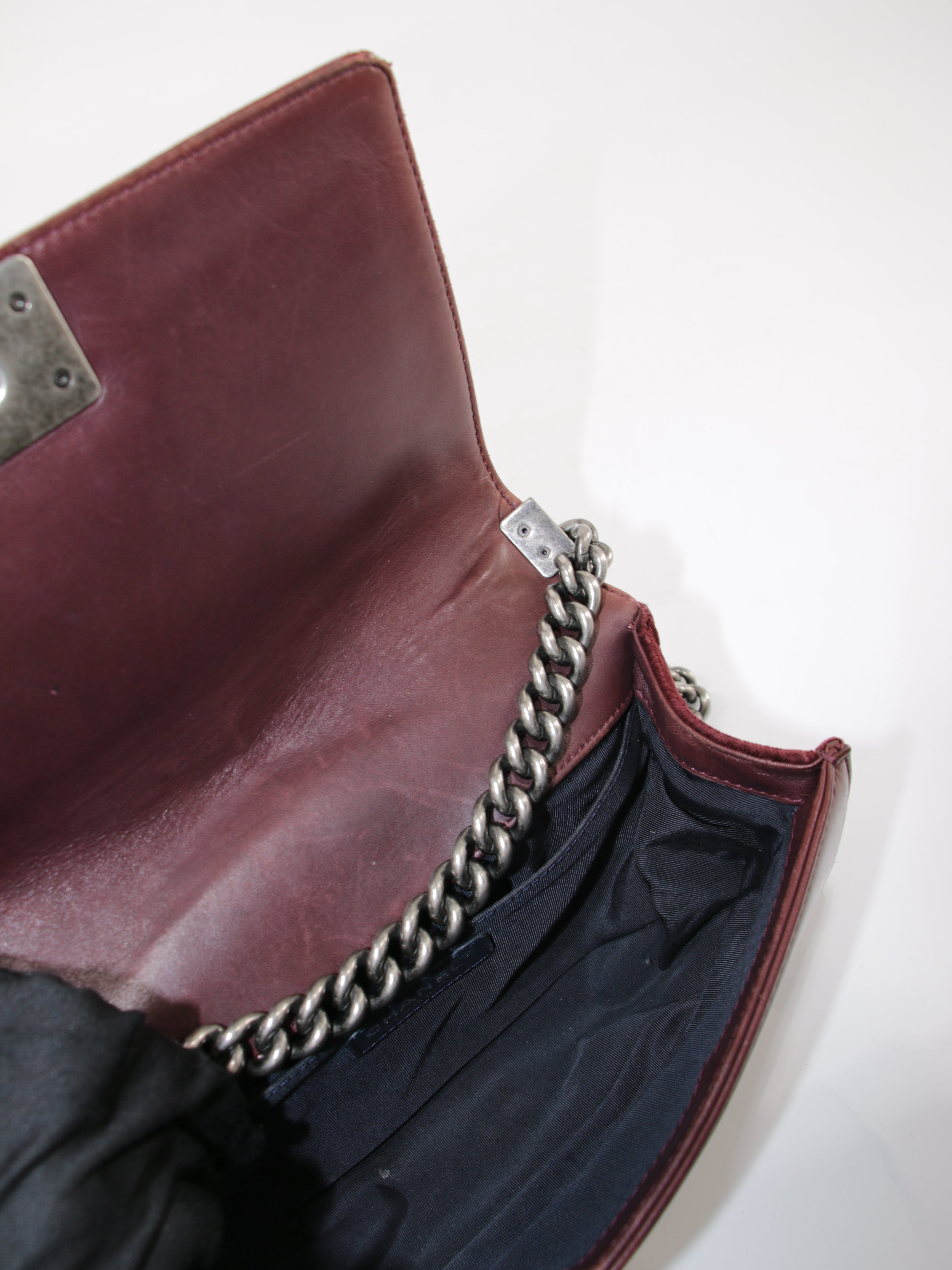 Brand: Chanel | Style: Chanel - Boy | Type: Shoulder Bag | Color: Bordeaux | Material: Velour | Macbook friendly: No | Height: 15 cm. Length: 25 cm. Width: 8 cm. | Condition: Good | SKU: 26146 The bag has corner wear and some general wear on the straps.