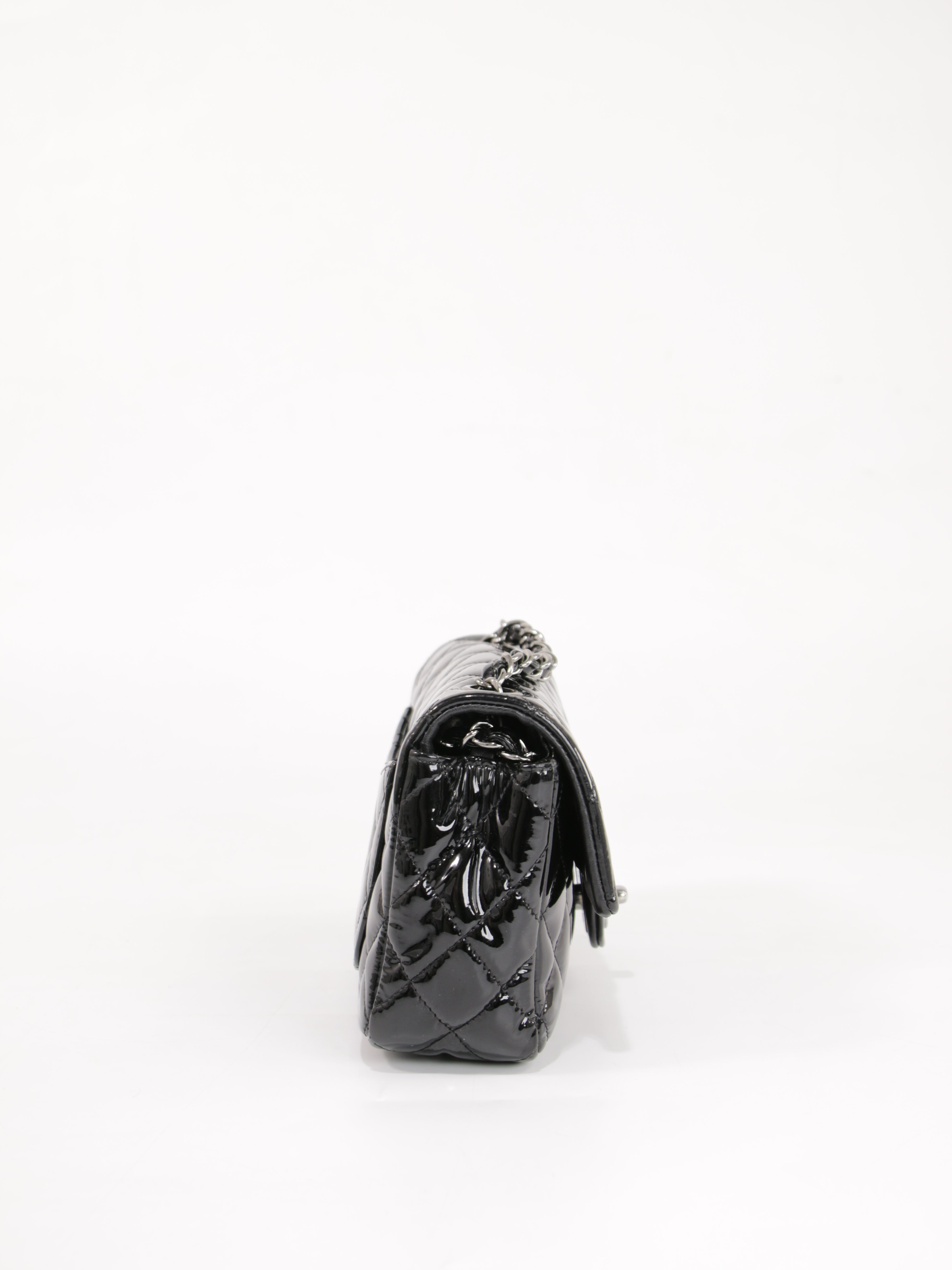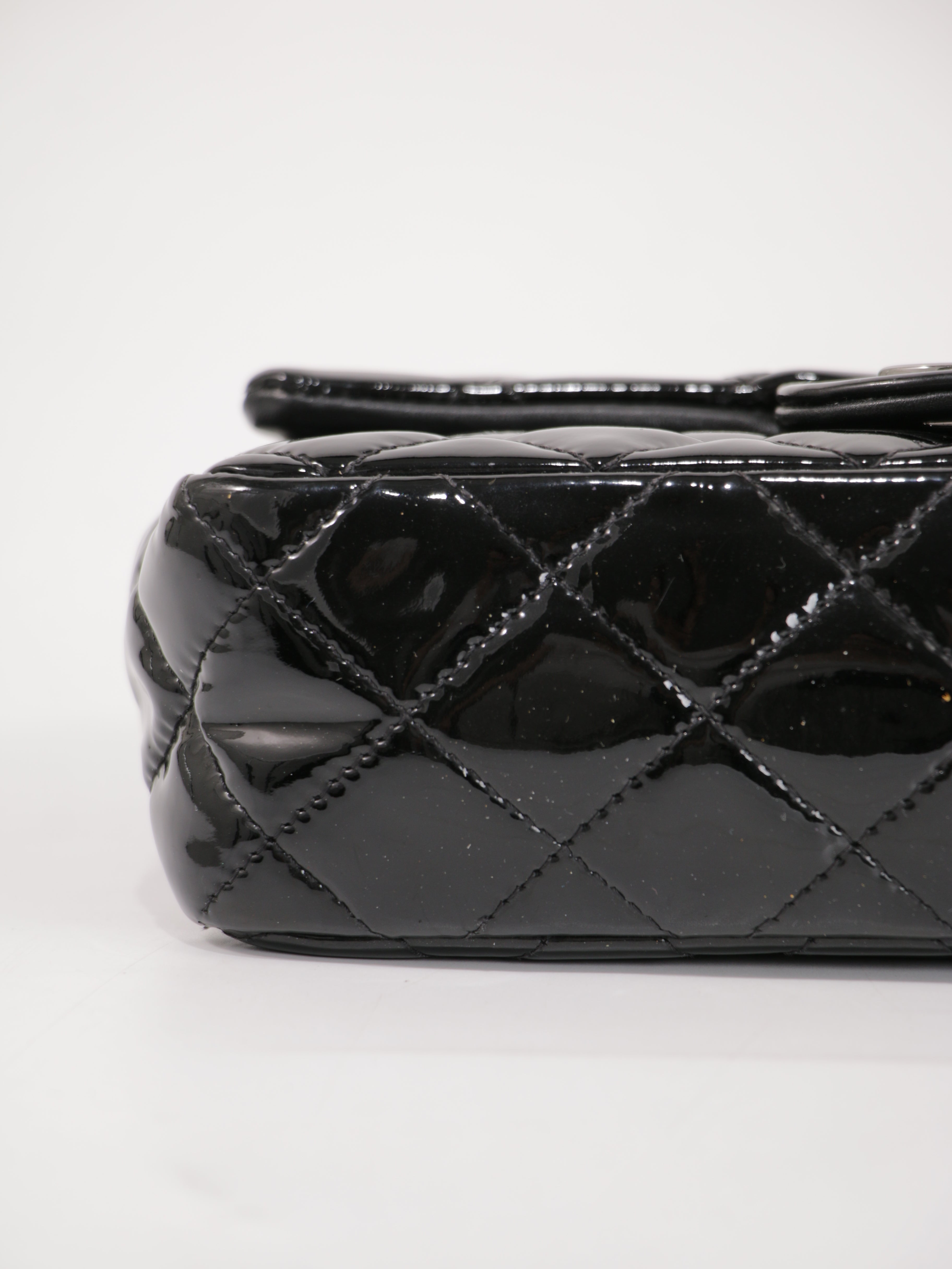 Brand: Chanel | Style: Mini Rectangular Flap | Type: Crossbody Bag | Color: Black | Material: Patent Leather | Macbook friendly: No | Height: 13 Length: 20 Width: 6 | Condition: Good | SKU: 24263