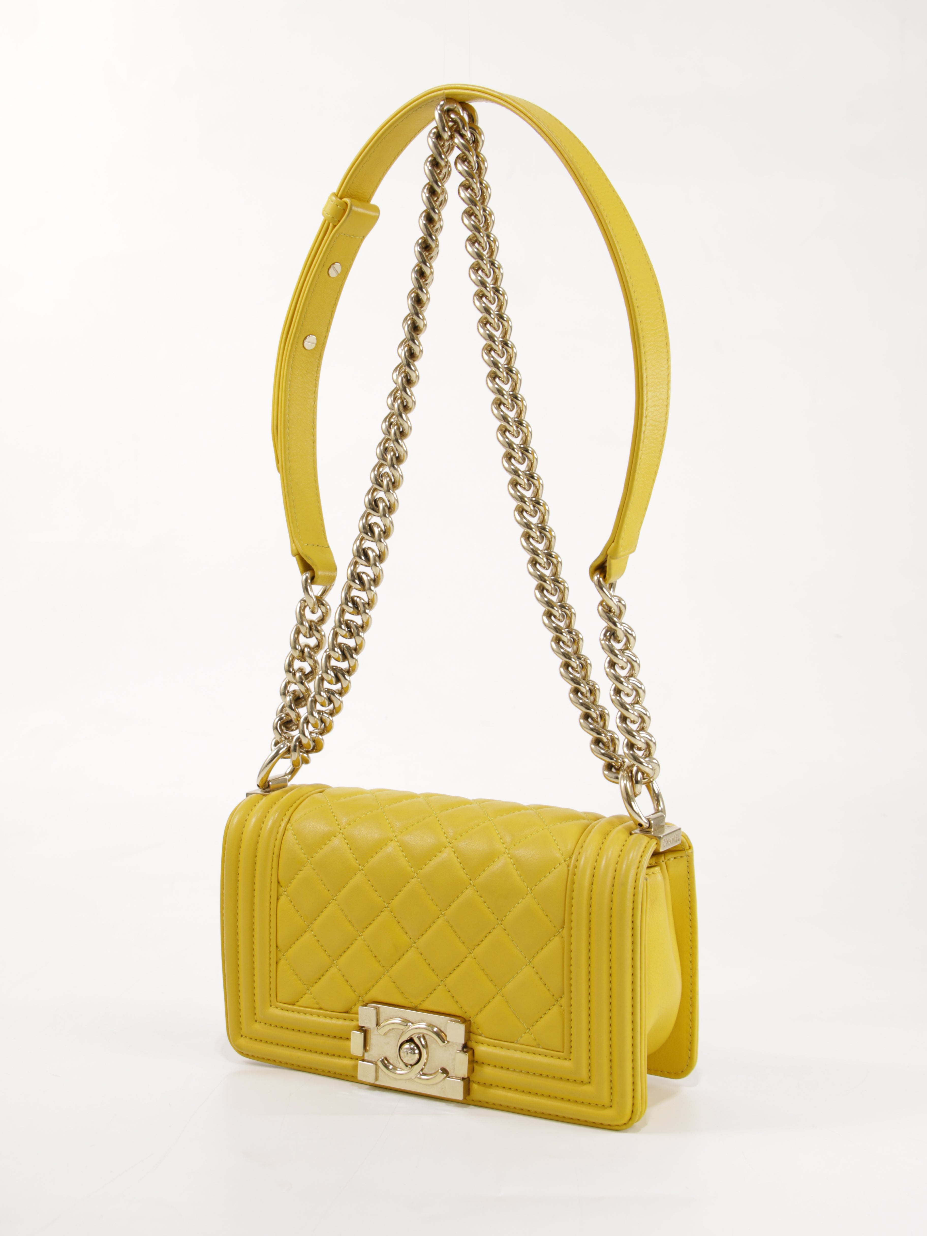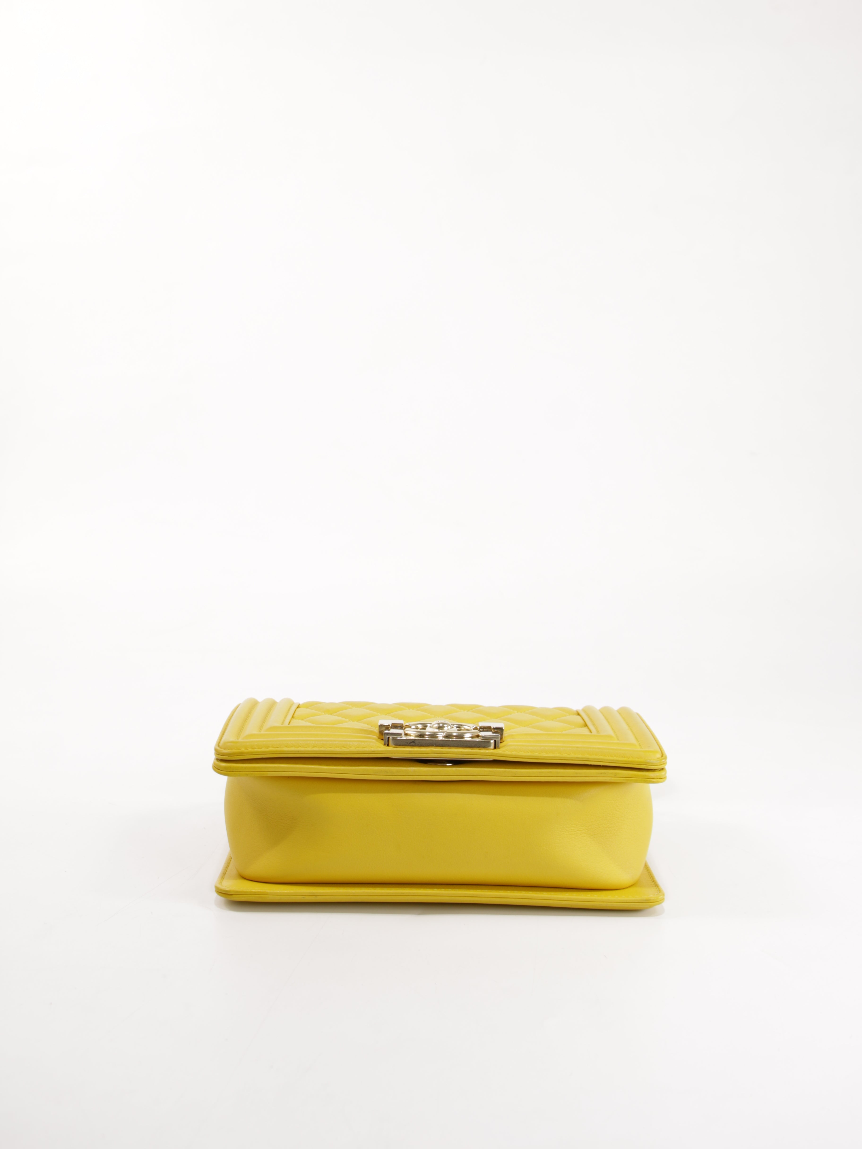 Brand: Chanel | Style: Chanel - Boy | Type: Shoulder Bag | Color: Yellow | Material: Leather | Macbook friendly: No | Height: 12 cm. Length: 20 cm. Width: 6 cm. | Condition: Very Good | SKU: 25742 This bag has some discoloration to the exterior.