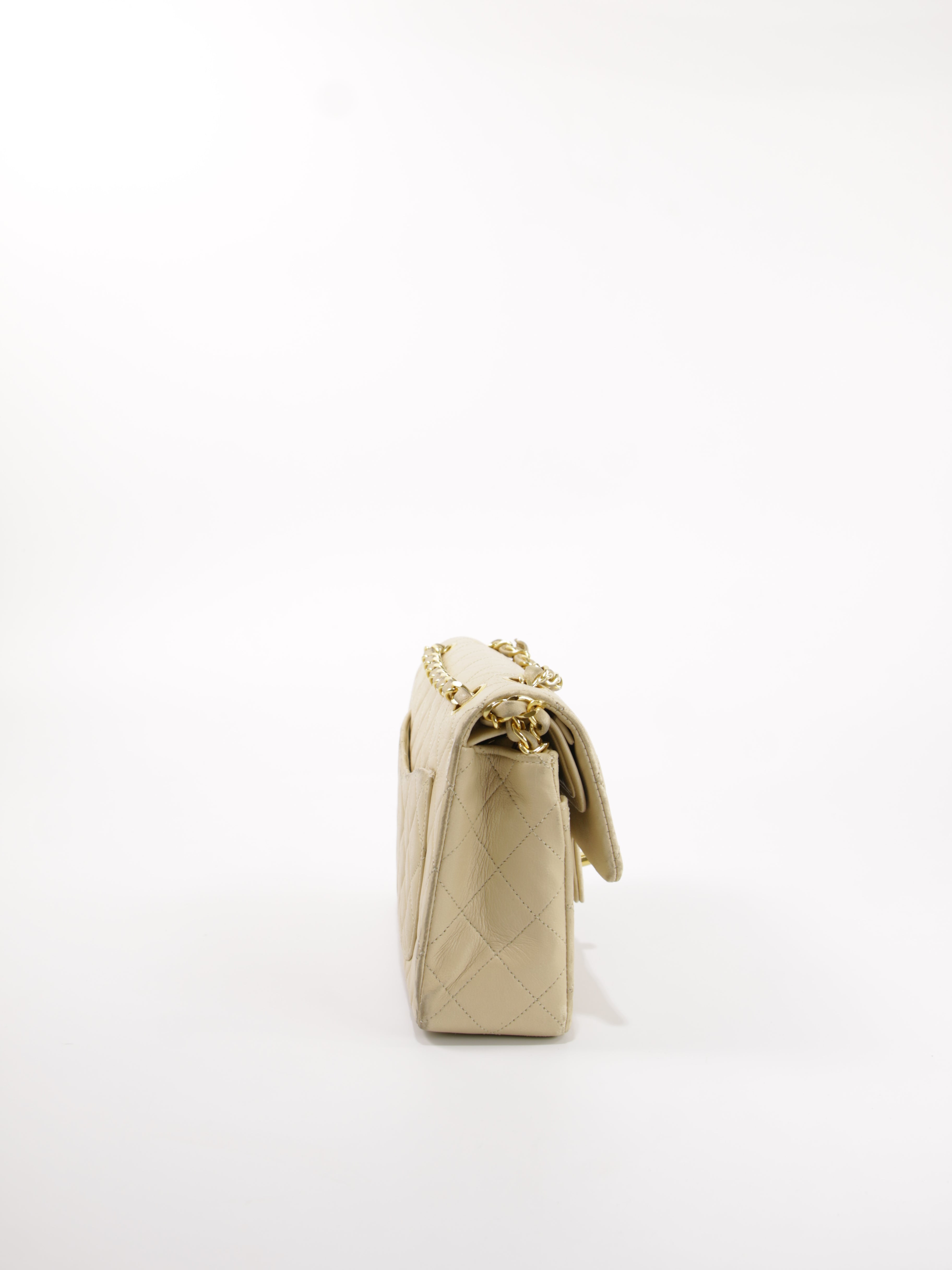 Brand: Chanel | Style: Chanel - Flap | Type: Shoulder Bag | Color: Beige | Material: Leather | Macbook friendly: No | Height: 14 cm. Length: 23 cm. Width: 6 cm. | Condition: Good | SKU: 26778 This bag has marks and scratches on the corners and some discoloration on the back.
