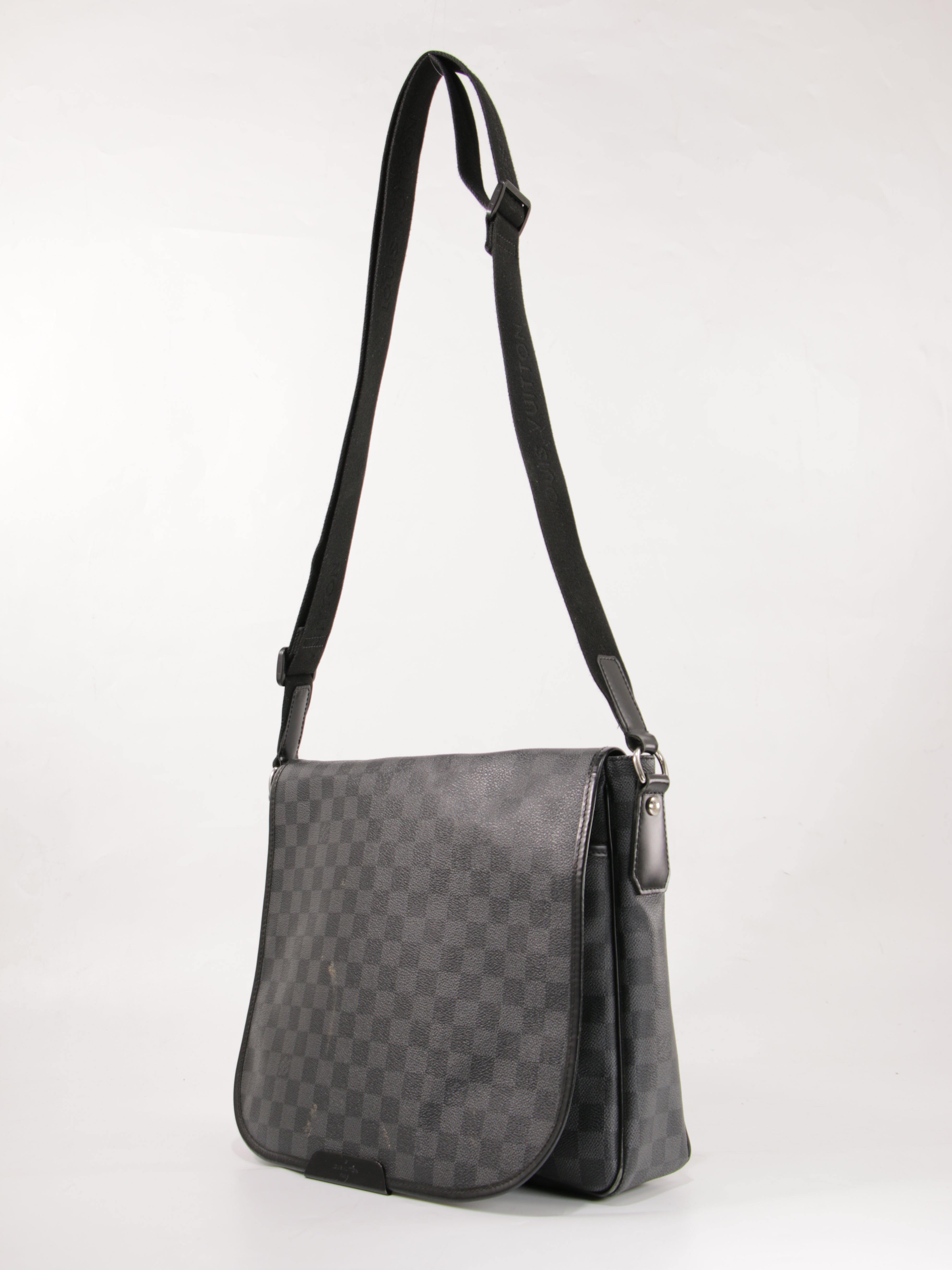 Brand: Louis vuitton | Style: Daniel MM | Type: Crossbody Bag | Color: Black | Material: Canvas | Macbook friendly: Yes | Height: 30 Length: 34 Width: 9 | Condition: Good | SKU: 23403 The bag has discoloration and marks on the exterior.